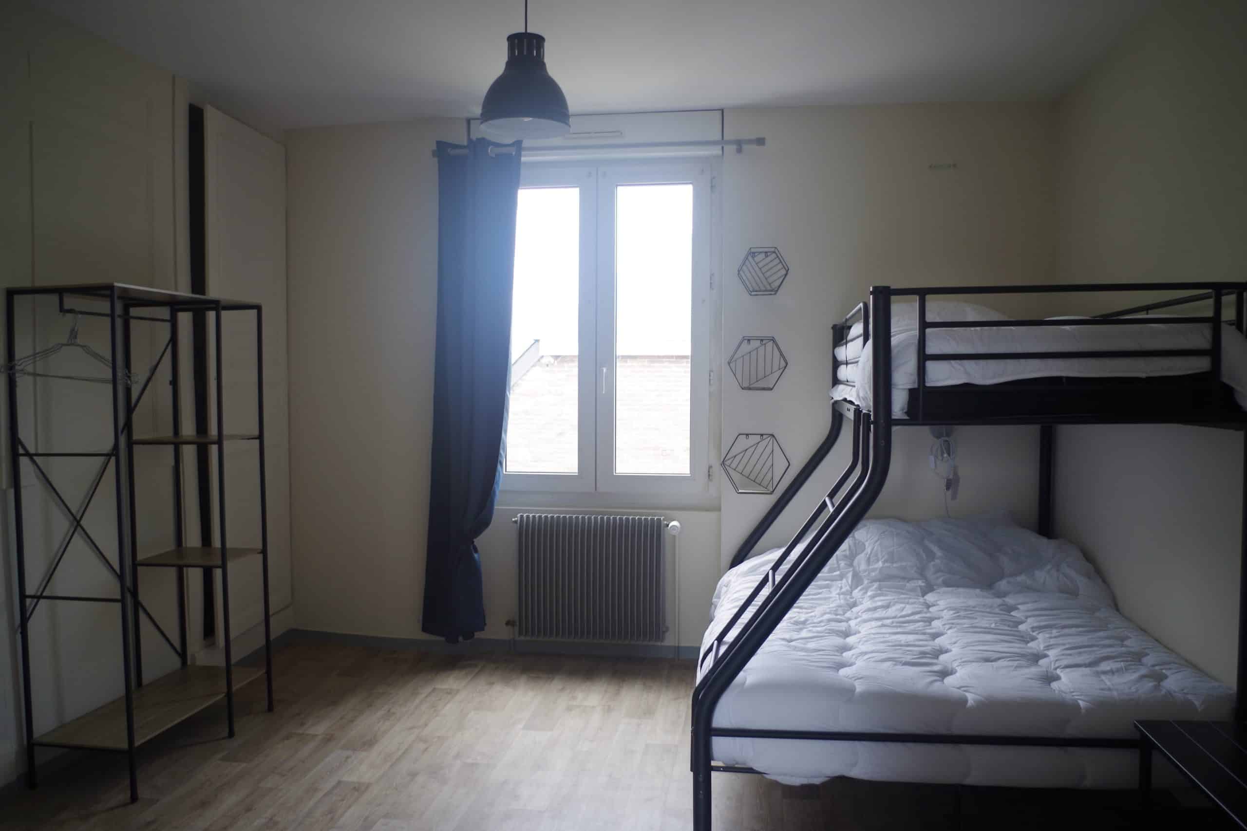 équipé d’ 1 couchage en lits superposés pouvant accueillir 2 personnes en bas (lit de 140x190) et 1 personne en haut(lit de 90x190).